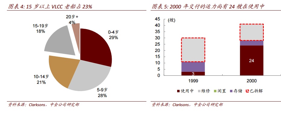 拆船到目前为止尚未明显增加,主要是由于部分船舶仍在执行今年初的高运价合同,往后看, 15 岁以上老船占 VLCC 的 23%,尤其是 2000 年交付的 24 艘船目前仍在正常使用中,今年将进入 20 岁船龄,我们预计后续拆解有望加速。