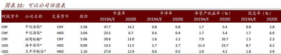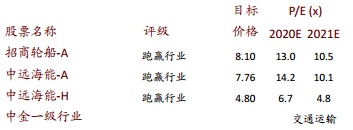 中金维持维持各公司盈利预测、跑赢行业评级和目标价不变。 当期股价对应于 2020 年估值:招商轮船 1.2 倍 P/B,中远海能-A 0.8 倍 P/B,中远海能-H 0.4 倍 P/B。