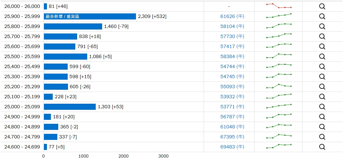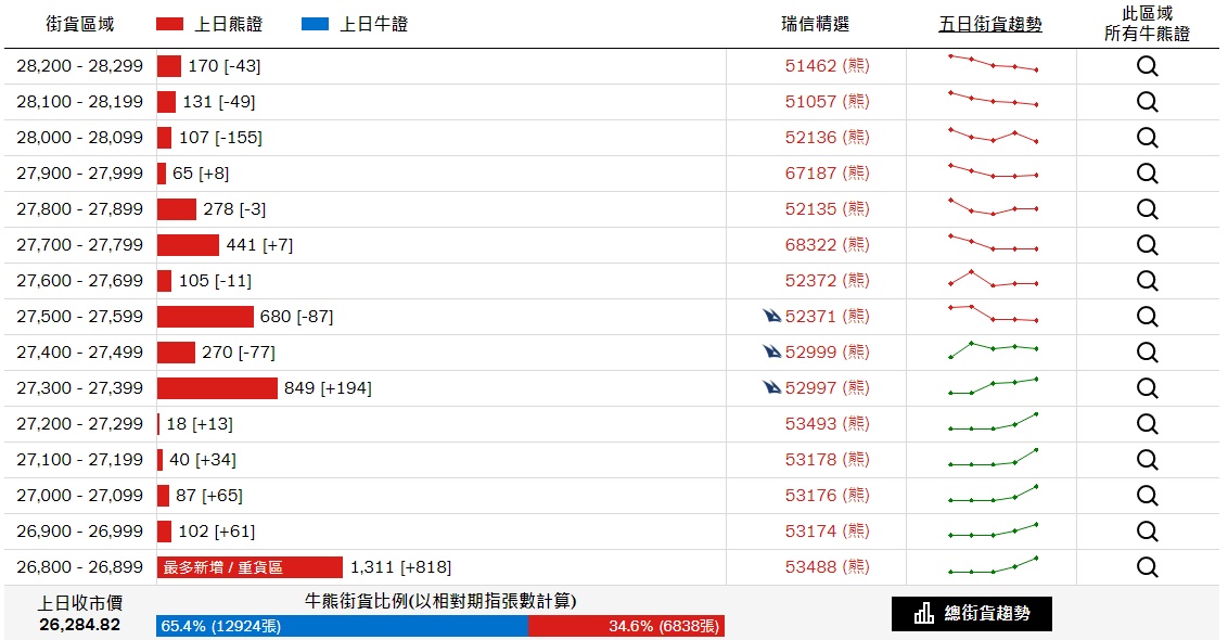 智通财经APP获悉,截至3月3日,恒指最新的牛熊街货比例65.4:34.6。瑞信恒指牛熊证街货分布图中的数据显示,熊证街货重货区在26800-26899区间,该区间最新熊证数量为1311张,较上一交易日增加818张,最多新增也在此区间。牛证街货重货区在25900-25999区间,该区间最新牛证数量为2309张,较上一交易日增加532张,最多新增也在此区间。