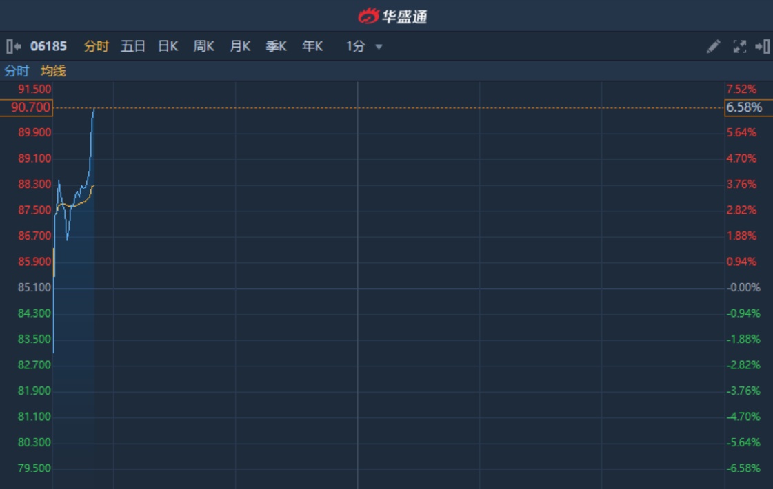 智通财经APP获悉,康希诺生物-B(06185)早盘急升逾6%,一度高见91.2港元,再度刷新历史新高,截至9时49分,涨6.58%,报价90.7港元,成交额1971万。