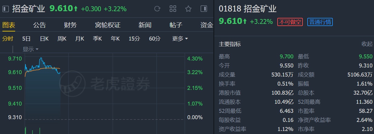 智通财经APP获悉,大摩发布报告称,相信招金矿业(01818)股价45日内将升,发生机会率超过80%,对其股份评级为“增持”,目标价10.52港元。