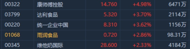 智通财经APP获悉,港股食品板块集体走高,截至11时38分,康师傅控股(00322)涨4.98%,报价14.76港元,达利食品(03799)涨3.7%,统一企业中国(00220)涨3.62%。
