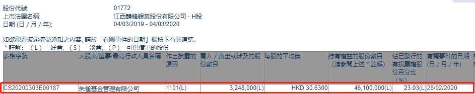 智通财经APP获悉,联交所最新资料显示,2月28日,朱雀基金增持赣锋锂业(01772)324.8万股,每股作价30.63港元,总金额约为9968.62万港元,增持后持股数目为4610万股,持股比例为23.03%。