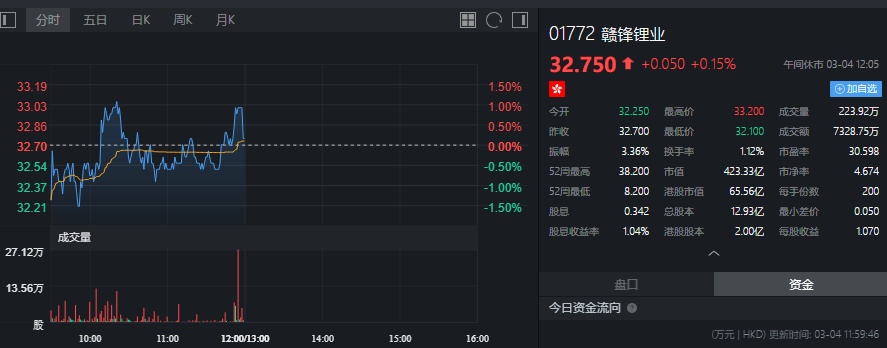 截至今日上午收盘,赣锋锂业涨0.15%,报32.75港元。