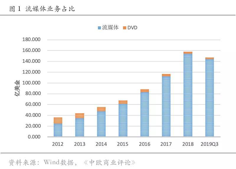 “在线看片的时代即将到来,并且在某个时候它将成为大生意。”奈飞联合创始人哈斯廷斯兴奋地表示。在此以后,流媒体业务的比重在奈飞的营收占比上不断加大,根据2019年三季报,奈飞流媒体收入占营收比重的98%,DVD收入只有微小的2%。