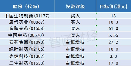 智通财经整理兴业证券最新医药股评级和目标价如下: