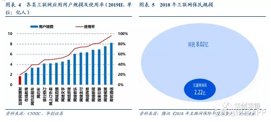 财富管理、保险行业互联网线上化程度与其他行业相差甚远,横向比较领先于全球其他国家。线上化程度高的行业普遍集中于社交媒体、消费品行业。截至2019年6月,我国网络购物用户6.39亿人,占网民整体的74.8%(CNNIC口径)。而金融行业中的财富管理、保险等互联网线上化程度相较其他行业甚远,截至2019年6月,互联网理财用户规模1.7亿人,占网民整体19.9%(CNNIC口径)。2018年互联网保民规模2.2亿人左右,占网民整体的27.7%。(腾讯《2018年互联网保险年度报告》)。