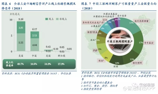 保险和财富管理产品有交汇的地方,整体特征较相近可归为一类。由于行业特性不同——1)产品、服务相对一般消费品和服务复杂,难以理解,需要较高专业门槛,网民中触达比例低;2)非必需品,触及网民的场景少,相较其他行业产品服务较难触达客户;3)消费成本高且一些产品具备长期属性,要求满足一定经济条件,试错成本高;4)监管制度较其他行业严格,在产品服务线上化方面相较其他行业有较多的监管限制——金融保险业与其他行业互联网线上化程度相差较远。中、美是世界上互联网发达程度数一数二的国家,但在互联网领域各有侧重:中国电子商务发达多年领先世界,但基础设施领域、互联网金融、财富管理等方面落后于美国。2018年美国财富管理线上化渗透率为40.7%,中国为34.6%,全球整体来看中国并不低。