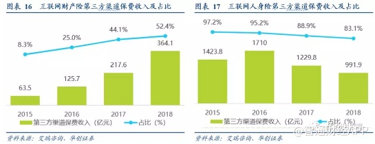 目前主要的互联网保险就是直销和专业中介与互联网融合的结果:保险公司官网(网页、微信小程序等)自营和第三方中介渠道网上销售——直销和专业中介与互联网结合。互联网保险以第三方中介渠道网上销售为主,特别是人身保险的线上销售,2018年互联网人身险第三方渠道保费收入占比达83.1%。
