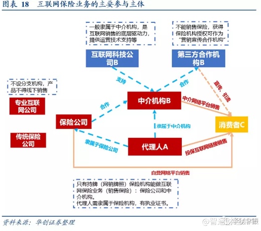 保险产品从保险公司出发到达C端消费者的销售流程中主要参与主体有以下几类:1)保险公司,又分专业互联网保险公司(不得线下或通过其他保险机构销售产品)和一般保险公司;2)具备网销资质的保险中介公司;3)保险机构第三方合作伙伴(网站、微信、APP等推广平台);4)中介机构代理人与保险公司代理人;5)互联网保险技术平台(互联网保险科技公司,一般隶属于中介机构,是互联网销售的底层驱动力,提供运营技术支持等)