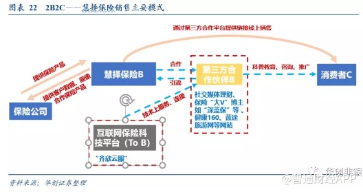 2B2C模式是保险中介机构通过第三方合作机构来对接C端消费者销售保险的模式。第三方合作机构主要是社交媒体中的内容运营博主、大V或特定的场景平台如旅行网站、健康网站等。