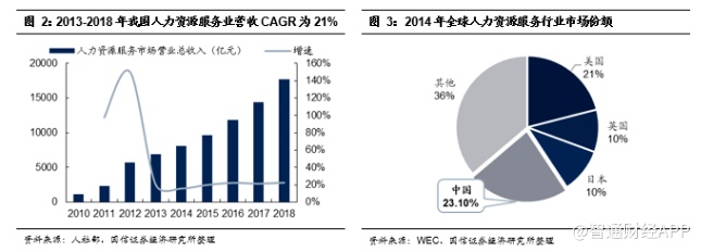 与之相比,日本Recruit市占率约为12%-15%,ADP在美国的市占率大概有15%,在这种情况下,随着国内人力资源服务龙头规模和人才信息库、技术系统等优势不断显现,市场份额仍有望快速提升,从而进一步加速龙头成长。