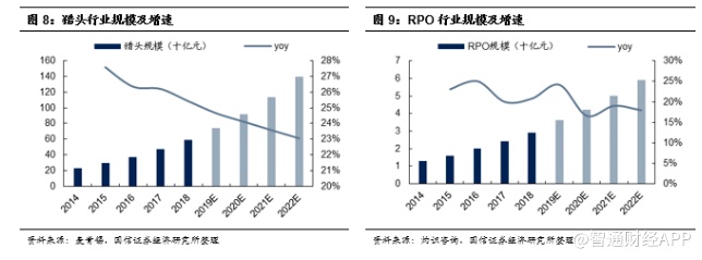 RPO:即招聘流程外包业务,全流程的RPO为客户提供组织架构咨询、设计招聘方案、招聘等全流程服务,业务附加值高,一般为在派驻顾问完成相应任务后收取相关费用。毛利率比前述两个业务都高,科锐国际的RPO毛利率为50%左右,但非全流程RPO的毛利率会相对低一些。业务采用竞标模式,比拼报价、服务和资源整合的能力,通常客户锁定一家人力资源服务机构后,基本上就会保持长期合作的关系。目前全流程RPO的市场规模比较小,因为通常只有员工规模在10万以上的企业,招聘需求非常大,才会采用这种外包的模式。能够提供全流程招聘外包的机构也相对较少。