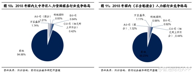 从行业竞争格局来看,我国人力资源服务行业机构仍高度分散。结合灼识咨询及行业龙头相关数据,主要考虑猎头、灵活用工、RPO等相关人力资源服务业务,截至2018年底,我国大中华区人力资源服务商超过20000家,其前5家龙头市场份额TOP5仅5.14%,若仅考虑国内不含港澳台,则前五家龙头TOP5也仅4.73%,总体集中度均较低。