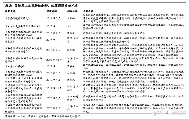 政策层面,持续利好明确鼓励。2020年2月7日人社部等四部门发布《关于做好新型冠状病毒感染肺炎疫情防控期间稳定劳动关系支持企业复工复产的意见》,明确提出鼓励协商复工前的用工问题(有条件员工可通过电话、网络等灵活办公)、鼓励灵活安排工作时间。此外,19年11月,浙江省人社厅发布《浙江省人力资源和社会保障厅关于优化新业态劳动用工服务的指导意见》,对灵活用工的用工方式、社保体系、技能培训、劳动纠纷等进行了说明,明确允许灵活用工方式,保障从业人员的权利。再加上此前放开户籍、降低个税、提高人才流动性等举措,为灵活用工方式提供了鼓励、保障的制度环境。