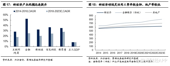 近几年新经济行业蓬勃发展,也成为了灵活用工服务行业增长的重要推动力之一。根据灼识咨询,按总商品交易额计,2014-2018年中国新经济产业年复合增速达30.4%,增速遥遥领先其他。且相较其他产业,新经济产业在用人方式上更为灵活,其商业模式为灵活用工的发展提供了沃土。但因为新经济类企业灵活用工略偏低端,所以费率较金融、地产等相对较低。