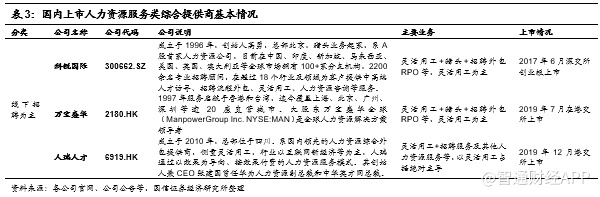 目前,国内人力资源服务综合龙头中,若主要考虑以线下招聘为主的综合人力资源方案解决商,主要包括A股上市的科锐国际及港股上市的万宝盛华(大中华)、人瑞人才等,各自基本情况如下表所示。