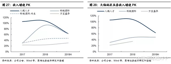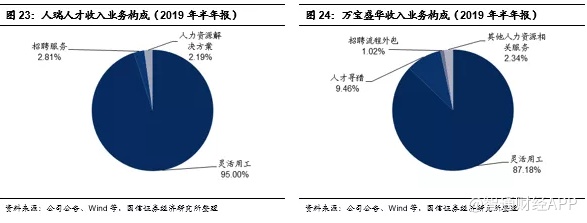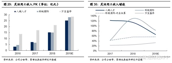 灵活用工PK:从灵活用工收入规模来看,万宝盛华和科锐国际预计已经较为接近,而人瑞人才与其二者的差距不断缩小。从增速来看,近几年三家龙头灵活用工业务增速都非常迅猛,其中科锐国际(剔除并购)和人瑞人才2019年灵活用工方面的收入同比增长在60%上下,万宝盛华预计也在30%以上。