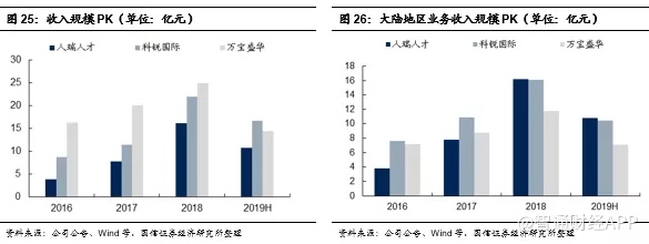 大中华区:人瑞人才和科锐国际规模相当。若仅关注中国大陆地区的业务规模,截至2019年上半年,人瑞人才和科锐国际旗鼓相当,二者收入规模分别为10.77亿元、10.48亿元,万宝盛华在港澳台布局较多,2019年上半年在大陆的收入为7.05亿,大陆业务规模稍逊于人瑞人才和科锐国际。