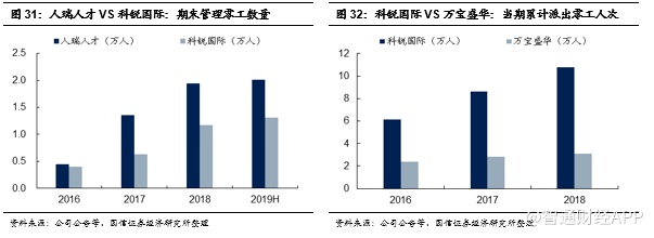 从管理的灵活用工业务派出人员规模来看,因为三家公司的披露口径有所不同,所以我们仅对同口径下的数据进行对比。人瑞人才和科锐国际都有披露年末管理的零工人数,2016年末时二者管理零工数尚为接近,2017年人瑞人才零工规模明显扩大,截至2019上半年已达2.02万人,而科锐国际的零工规模增长比较平稳,截至2019上半年共有1.31万人。管理零工规模的增长支撑业务量的提升。万宝盛华和科锐国际都有披露累计派出零工人次,二者的累计派出人次差异远高于收入规模差异,预计主要是因为科锐国际部分短期灵活用工项目周期较短。