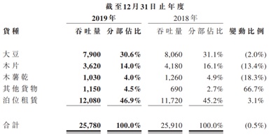 市场波动较大的2019年,日照港裕廊主要货种吞吐量全面下滑。智通财经APP了解到,公司是由A股上市企业日照港(600017.SH)分拆出来,旗下港口位于日照港石臼区,提供装卸、泊位租赁、港务管理、堆存及物流代理服务等综合性港口相关服务,主要涵盖大豆、木片及木薯干等货种,目前公司运营着4个泊位以及租出了4个泊位。2018年公司的大豆及木片进口吞吐量为全中国第一,木薯干进口吞吐量则为全国第二。