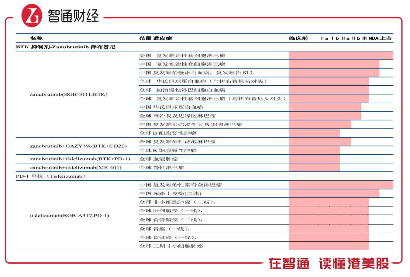 公司在研产品覆盖实体瘤和血液肿瘤,以下为公司部分在研管线及商业化管线:
