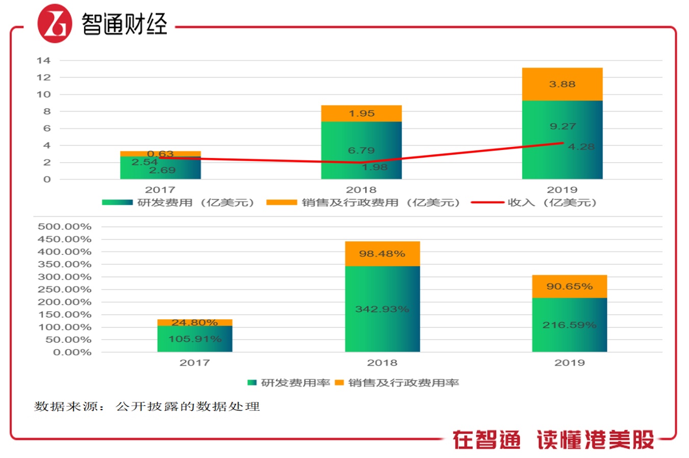 该公司亏损持续扩大的原因主要受两项费用影响,一是研发费用,二是销售及管理费用。该公司重视研发,把资金重心砸向研发领域,特别是自主研发,2018年研发费用高达6.79亿美元,同比增长152.4%,2019年攀升至9.27亿美元,同比增长36.5%。过往三年,研发费用率均超过100%,2019年为216.6%。