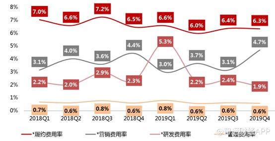 智通财经APP观察到,2019Q4京东整体的经营费用率14.2%,2018年同期为14.9%,细分看,2019Q4除了营销费用率上升至4.7%,其他费用履约费用、研发费用、管理费用整体呈下降趋势,而营销费用上升则与京喜推广及期内双十一等营销活动有关。