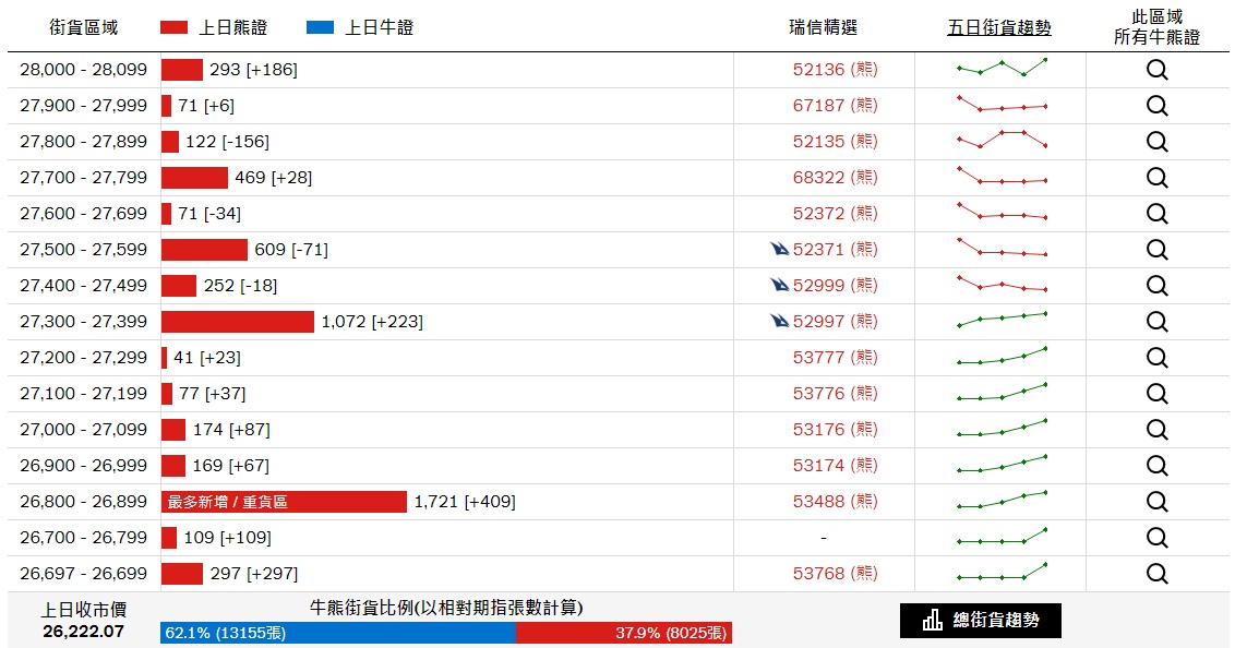 智通财经APP获悉,截至3月4日,恒指最新的牛熊街货比例62:38。瑞信恒指牛熊证街货分布图中的数据显示,熊证街货重货区在26800-26899区间,该区间最新熊证数量为1721张,较上一交易日增加409张,最多新增也在此区间。牛证街货重货区在25900-25999区间,该区间最新牛证数量为2181张,较上一交易日减少128张,最多新增在25600-25699区间,该区间最新牛证数量为944张,较上一交易日增加152张。