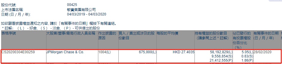 智通财经APP获悉,根据联交所资料显示,2月28日,摩根大通增持敏实(00425)67.50万股,每股作价27.4035港元,总值约1849.74万港元。增持后最新持股数目约5819.28万股,最新持股比例为5.05%。