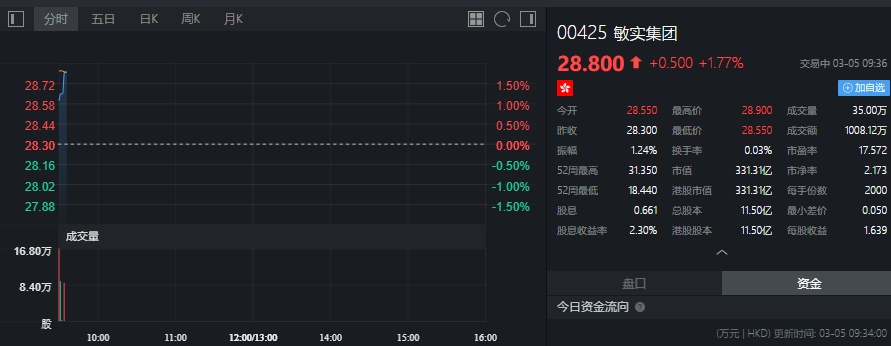 今日开盘,截至发稿,敏实涨1.77%,报28.80港元。