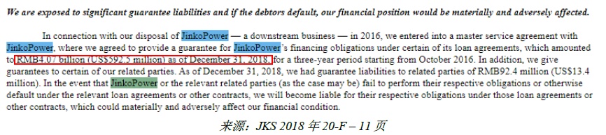 收购后李董事长继续使用JKS的资源为晶科电力提供财政支持。JKS的20-F年报披露,从2016年第4季度到2018年,JKS向晶科电力出售了5.28亿元人民币的太阳能电池组件,而截至2018年末,晶科电力拖欠JKS的用于购买太阳能电池组件的应付账款为5.23亿元人民币。除此之外,JKS还提供5.93亿美元的财务担保,作为晶科电力现有贷款义务的后盾。截至2018年末,JKS为晶科电力提供了总值多于6.50亿美元的财政支持。