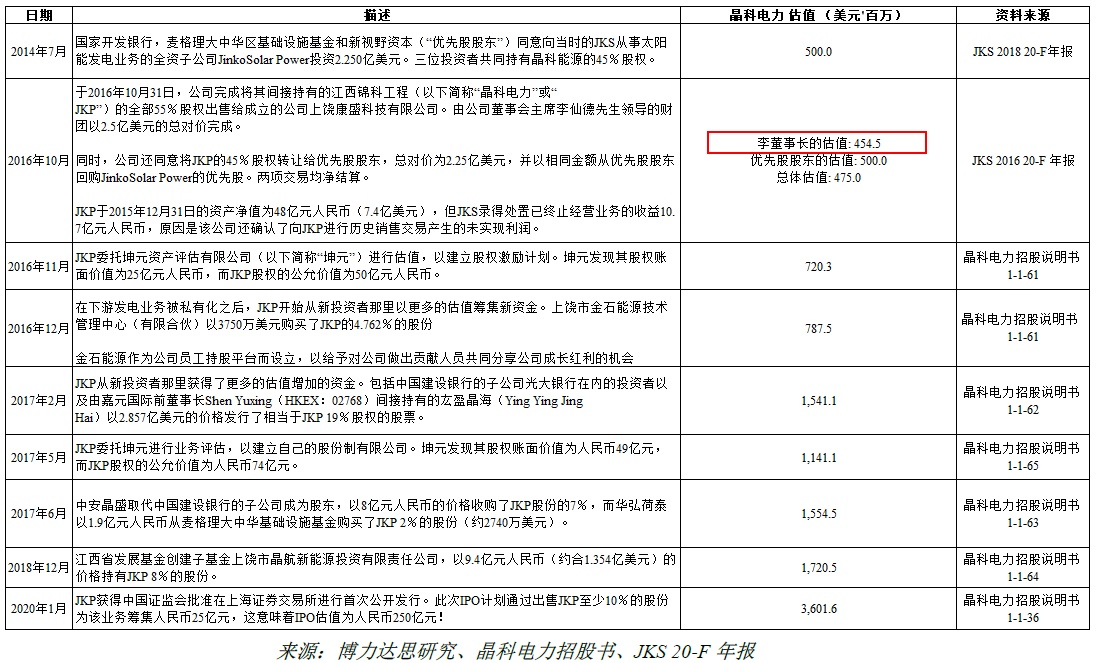 2016年10月,JKS以4.55亿美元的估值(32亿元人民币)将晶科电力出售给李董事长。一个月后于2016年11月,晶科电力的股东权益被独立评估为7.20亿美元,并以7.88亿美元的估价从中国内部人士那里筹集资金。对我们来说,事实很清楚,李董事长以比市值折让多于40%的价格收购了晶科电力。