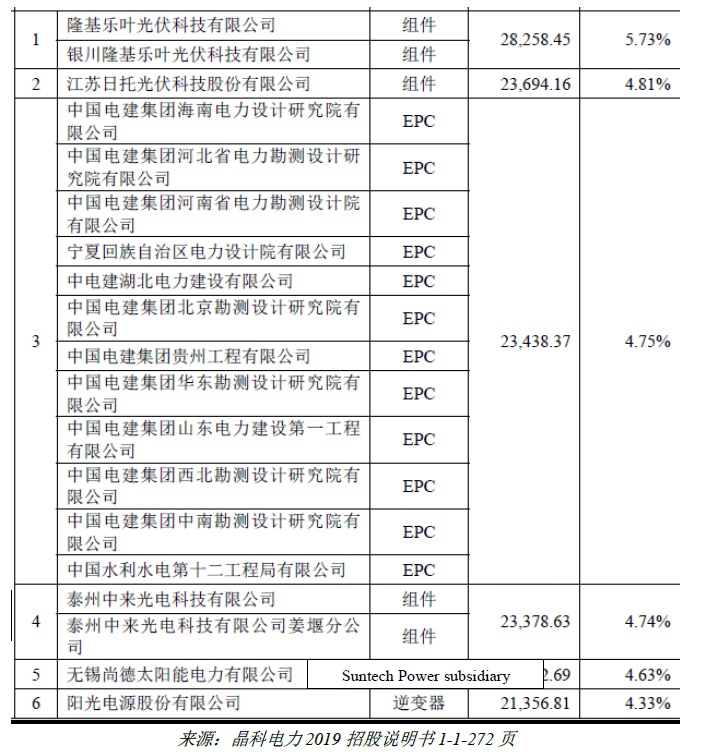 可能会令股东感到震惊的是,晶科电力在过去两年从JKS 购买的太阳能组件明显比晶科电力从其他太阳能组件制造商购买的金额少得多。 2018 年,JKS 向晶科电力出售了仅3,900 万元人民币的太阳能电池组件,仅占晶科电力2018 年采购总额的1%。晶科电力披露,按购买量计,JKS 不再是其十大供应商之列。相反,前十名供应商包括其他几个太阳能电池组件生产商,包括隆基股份(股票代码:601012),中来股份(股票代码:300393)。