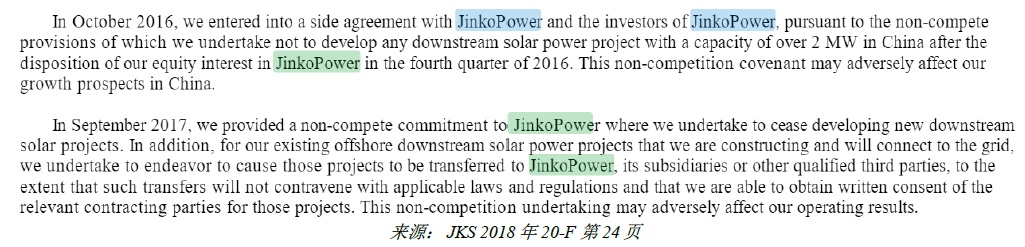 李董事长并没有止于单单抢劫JKS,而是希望JKS 全身退出下游太阳能发电的业务。在没有任何解释的情况下,晶科电力的销售协议中又嵌入了另一项自私自利条款。异于典型的5 年同业竞争限制,JKS 做出的承诺是绝对和永恒的:JKS 将“停止开发新的下游太阳能项目”,JKS 承诺“我们正在建设并将连接到电网的现有离岸下游太阳能项目”将转让给晶科电力。