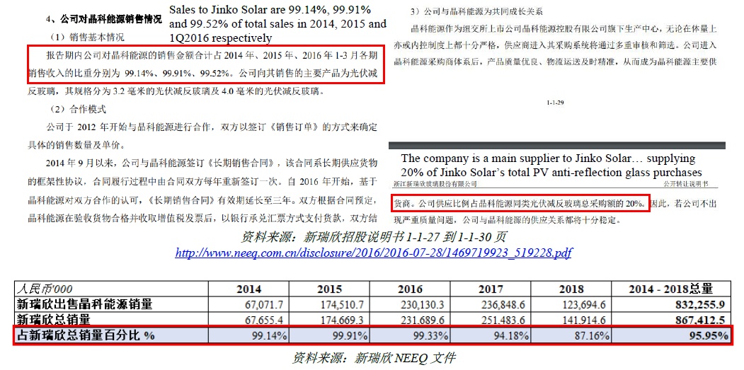 新瑞欣的中国招股说明书显示,在其业绩记录期间,JKS 贡献了新瑞欣收入的99%以上,而且从2014 年到16 年第一季度,该公司提供了JKS 光伏减反射玻璃总采购量的20%。既然新瑞欣的业务是专门为JKS 提供服务,那么为什么新瑞欣不属于JKS?