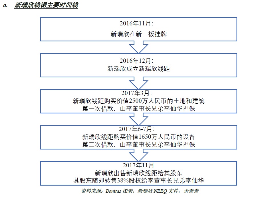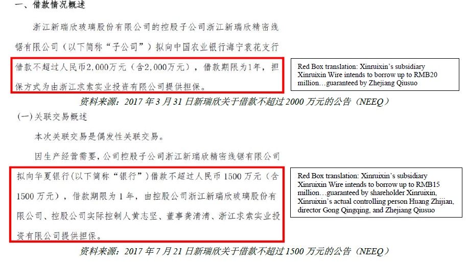新瑞欣线锯需要现金,于2017 年3 月至2017 年7 月分两期借款至多人民币3500万元。奇怪的是,这两笔贷款均由浙江求索实业投资有限公司(“浙江求索”)提供担保。而相关时期,浙江求索由李仙华控制,并持股93.5%。