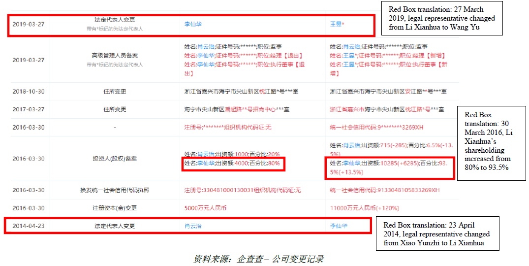 不到一个月的时间,新瑞欣线锯38%的股份被转卖给了李仙华,使他成为新瑞欣原主要子公司的最大股东。随着他新拥有的股权,他也承担了新的职责,例如新瑞欣线锯的董事长,法务代表和经理。