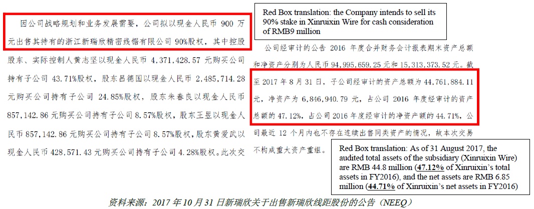 2017年10月31日,新瑞欣将其所持有的全部新瑞欣线锯90%股权出售给了新瑞欣的现股东们。当时,新瑞欣线距总资产占新瑞欣的47%。