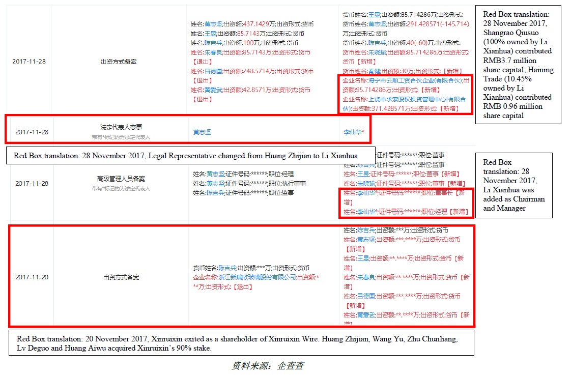 在新瑞欣线锯借款时,李仙华既不是新瑞欣线锯或新瑞欣的股东,也没有在新瑞欣的NEEQ 文件中列为董事会成员或主要管理层。可是显然他对新瑞欣或新瑞欣线锯有重大影响,或者与它们紧密联系,以使银行可以接受他的公司为新瑞欣线锯提供担保。实际上,浙江求索是新瑞欣线锯首笔贷款(最高2000 万元人民币)的唯一担保人。如果李仙华和新瑞欣或新瑞欣线锯没有关系,他为什么会这样做?