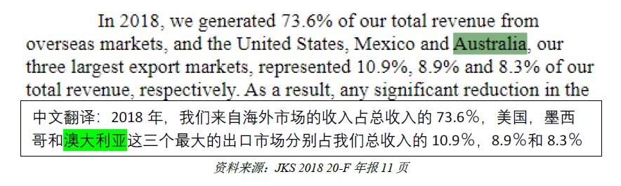 JKS提交给SEC的文件显示,澳大利亚的销售额从2016年的3700万美元(2.61亿元人民币)增至2018 年的超过302 百万美元(20多亿人民币),两年内增长了696%。