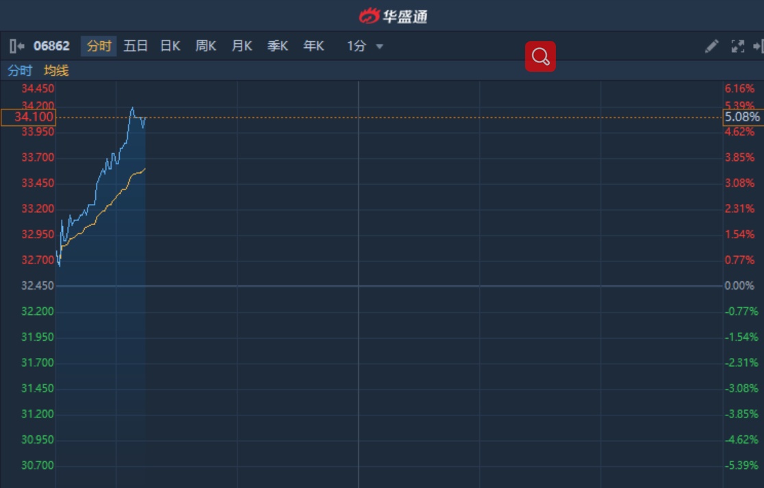智通财经APP获悉,海底捞(06862)突获资金热捧,早盘直线拉涨逾5%,突破120日均线,截10时13分,涨5.08%,报价34.1港元,成交额9641万。