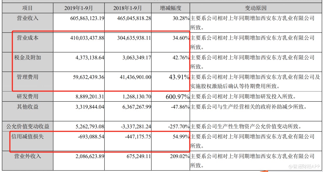 据庄园牧场三季报,由于东方乳业并表,公司营收同比增长30.28%,但并表也导致公司营业成本、税金及附加、管理费用分别增长34.6%、42.76%和43.91%。
