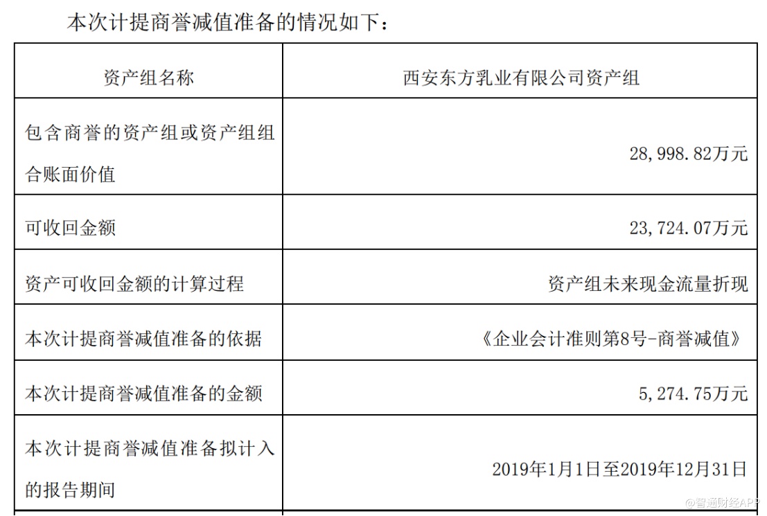 庄园牧场在公告中表示,公司按照总体发展战略于2019年对西安东方乳业有限公司的经营策略、渠道建设及管理团队等方面做了相应调整,该调整于2019年尚未发挥效益,导致2019年业绩下滑,低于形成商誉时的预期,经过商誉减值测试,商誉所在资产组可收回金额低于账面价值5274.75万元,确认为商誉减值损失。本次计提的商誉减值准备计入公司2019年度损益。