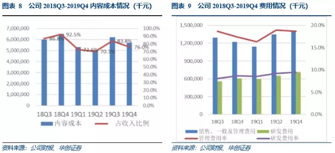 2019年第四季度爱奇艺内容成本57亿元,同比下降12.3%,占收入比重相比第三季度83.8%下降至76.0%。限薪令政策落地使得2019年上半年采购的部分内容延期至Q3及Q4,导致三、四季度内容成本偏高。长期来看,限薪令将促进成本支出持续改善,未来内容成本占比有望持续下降。