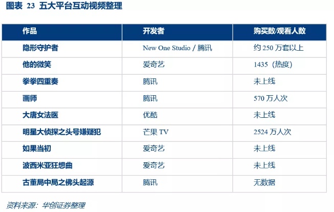 爱奇艺的互动内容包含互动电影、互动剧、互动综艺、互动游戏、互动小说和互动漫画等全业务领域,同时搭载互动视频技术平台与标准。19年5月,爱奇艺在世界智能视频科技论坛上宣布发布首个互动视频技术标准,六月就发布了第一部互动剧《他的微笑》,其中包含21条故事线和11个可能的结局。七月也即将推出第二部互动剧《如果当初》。从目前互动影视储备来看,爱奇艺在五大视频平台中保持领先地位。