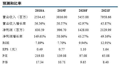 2019年公司业绩略超我们预期,同时考虑到2020Q1疫情的影响,我们略微下调2020年的业绩预测。我们预测2019-2021年,公司实现归母净利润分别为9.97、14.28和21.30亿元,分别同比增长58.06%、43.27%和49.16%,对应当前股价PE分别为139、97、65倍,维持“增持”评级。