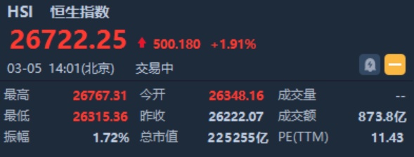 智通财经APP获悉,恒生指数午后涨幅持续扩大,升逾500点收复10日均线,蓝筹股全线上扬,截至14时01分,恒指涨500.18点或1.91%,报26722.25点,成交额暂为873.8亿。