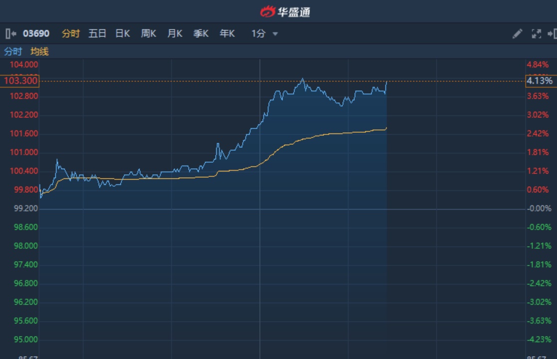 智通财经APP获悉,美团点评-W(03690)今日高开高走,午后涨幅扩大逾4%,收复多条均线,截至14时29分,涨4.03%,报价103.2港元,成交额27.82亿。