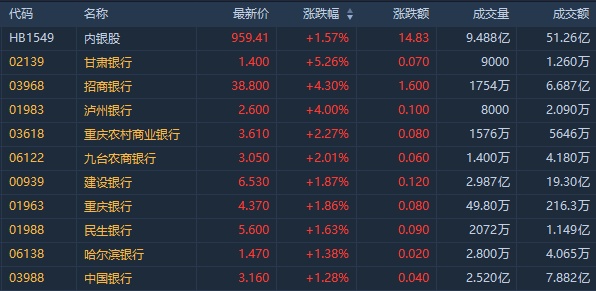 截至发稿,招商银行涨4.3%,报38.8港元;重庆农村商业银行(03618)涨2.55%,报3.62港元;建设银行涨1.87%,报6.53港元;中国银行(03988)涨1.28%,报3.16港元。